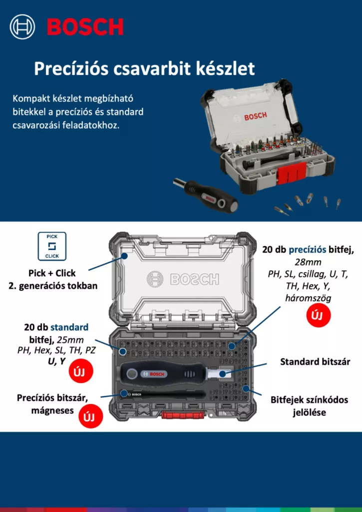 A Bosch 43 részes csavarhúzókészlete tökéletes választás barkács vagy professzionális használatra. Ebben a precíziós bitkészletben minden megtalálható ami miatt miatt ideális okostelefonok, játékkonzolok, laptopok, asztali számítógépek, kisgépek és még sok más eszköz szerelésére és javítására. Ez a készlet tartalmaz 20db színkódolt precíziós csavarhúzó bitet, és 20db 1/4"-os normál csavarhúzó bitet valamint a hozzájuk tartozó fogantyúkat. Kompakt megoldás a könnyű javításhoz. Ideális okostelefonok, játékkonzolok, elektronikai cikkek és készülékek javításához.