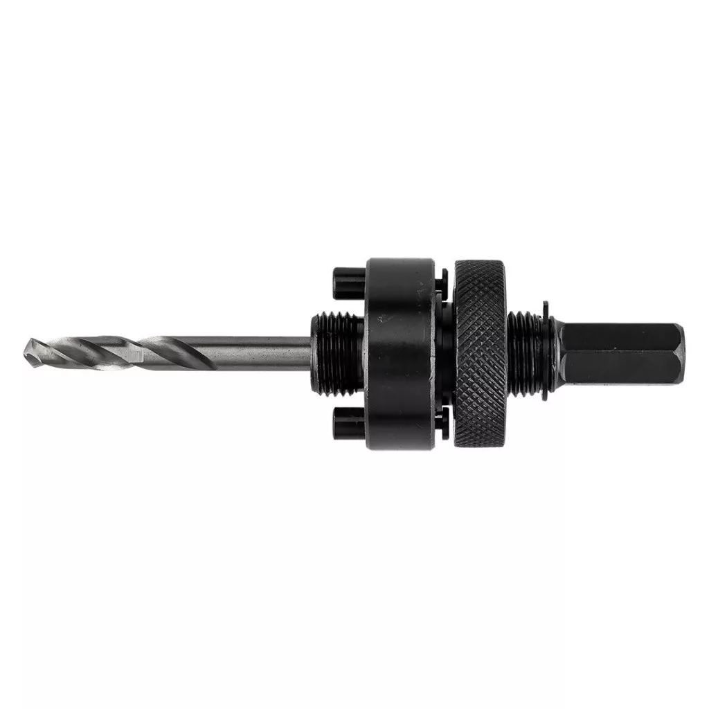 A GRAPHITE 6,35 mm-es próbafúró adaptere 32-152 mm-es bi-fém lyukfűrészekhez, Hex 56T754 32-152 mm átmérőjű bi-fém lyukfűrészekhez készült. 7/16" HEX szárral rendelkezik. A kísérleti fúrófej HSS anyagból készül. Az adapter fém, rozsdamentes acél (Inox), öntöttvas, sárgaréz, alumínium és fa fúrásakor használható. A készlethez tartozik egy csavarral rögzített vezetőfúrófej. A GRAPHITE márkájú adaptert bifém lyukfúrófúrók fúrógépekbe történő felszereléséhez tervezték.