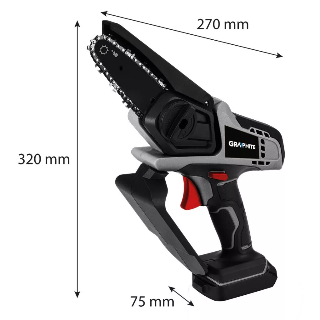 AzEnergy+ 18 voltos 58GE116 GRAPHITE mini akkumulátoros láncfűrészt a GRAPHITE márka legkorszerűbb rendszere hajtja, amely nagy teljesítményű Energy+ akkumulátorokon alapul. A láncfűrész 18 V-os lítium-ion akkumulátorral kompatibilis. A szerszámot a kertben való használatra tervezték, ágak kivágására vagy metszésére, szűk helyeken. A mini láncfűrész lineáris láncsebessége (terhelés nélkül) 0 ÷ 4,6 m/s.