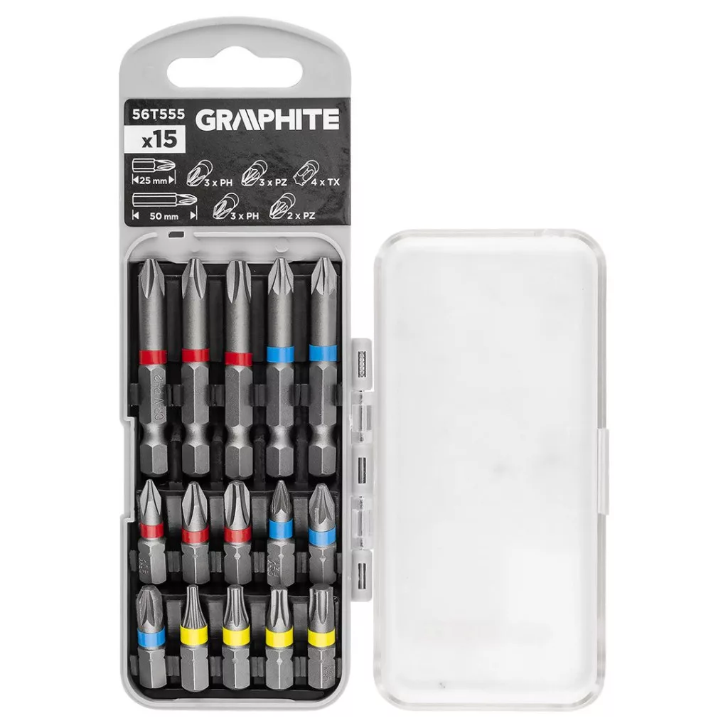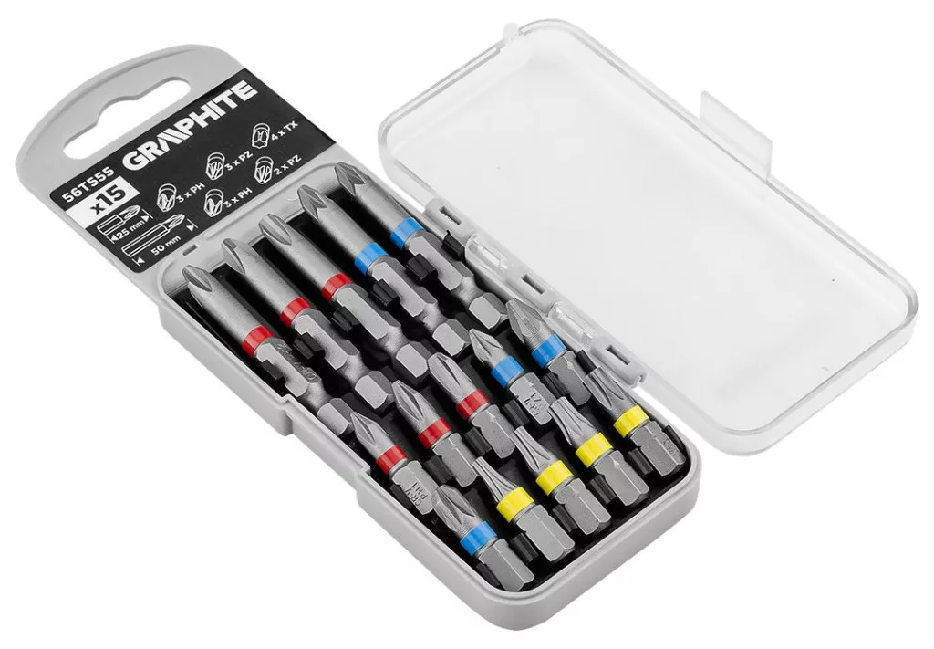 Bitsorozat PH2x2, PH3, PZ2x2 x 50 mm, PH1/2/3, PZ1/2/3, TX10/20/25/30 x 25 mm 15 darab 56T555 a GRAPHITE-tól 15 darab bitből áll: PH1, PH2, PH3, PZ1, PZ2, PZ3, TX10, TX20, TX25, TX30 25 mm hosszúságban és 2x PH2, PH3, 2x PZ2 50 mm hosszúságban. Minden tartozék 1/4"-os hatlapos fogantyúval rendelkezik, és kemény króm-vanádium acélból (CrV) készült - így biztosítva a sokoldalúságot és a megfelelő tartósságot a használat során.
