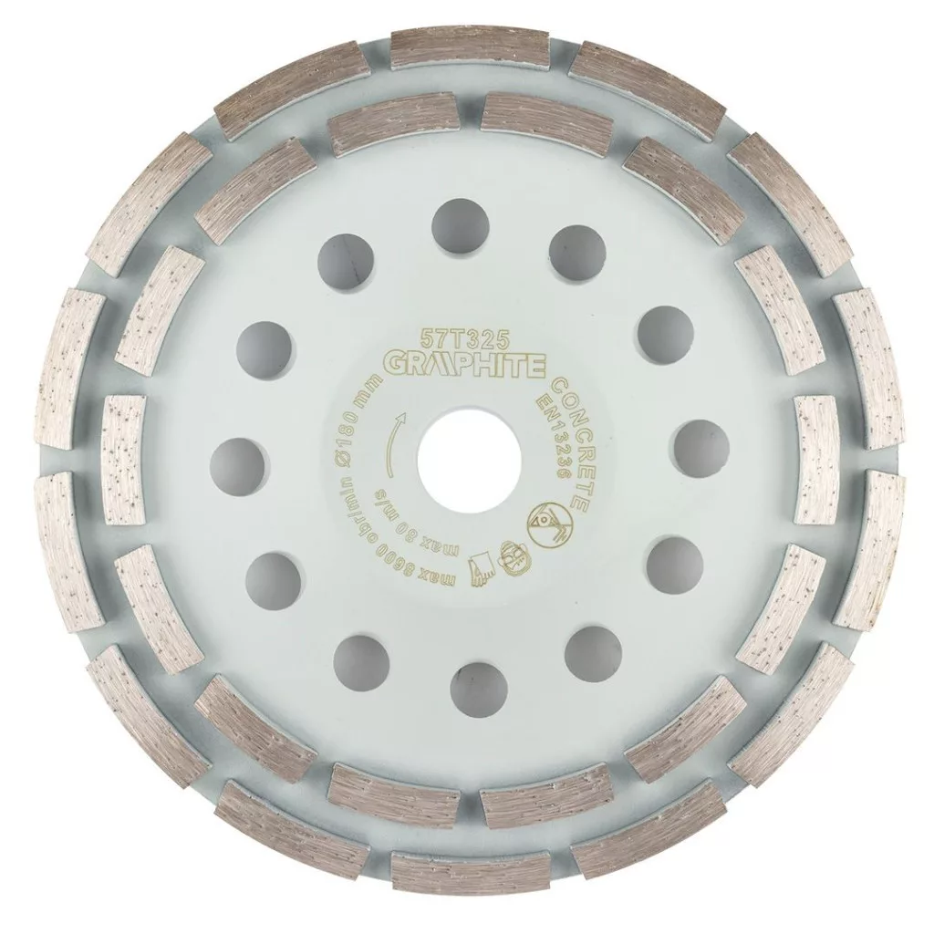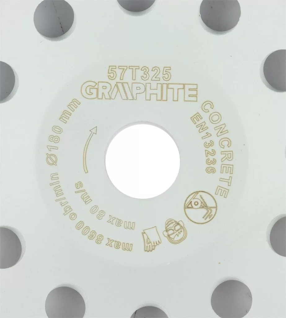 GRAPHITE 57T325 gyémántcsiszoló korong, 2 szegmens, 180 x 22,2 mm, száraz Az 57T325 két szegmenssel van felszerelve és száraz használatra tervezték. A készlet redukciós gyűrűket tartalmaz. A szegmenseket 5 mm-es magasság és 8 mm-es szélesség jellemzi. A GRAPHITE tárcsa maximális sebessége 8 600 fordulat/perc, ami 80 m/s-nak felel meg. A tárcsa beton, pórusbeton, tégla és kő csiszolásához készült. A tartozékban lévő lyukak javítják a hűtést működés közben, és hatékonyan távolítják el a port és a csiszolóanyagot. Ezáltal a csiszolás gyorsabbá és hatékonyabbá válik. A gyémántbevonatú szegmensek hatékony és eredményes csiszolást biztosítanak. Egyenletesen kopnak, ami szintén garantálja az egyenletes munkaminőséget. A szegmentált kialakítás javítja a hőelvezetést és megakadályozza a tárcsa túlmelegedését. A GRAPHITE terméke megfelel az EN 13236 szabvány követelményeinek.