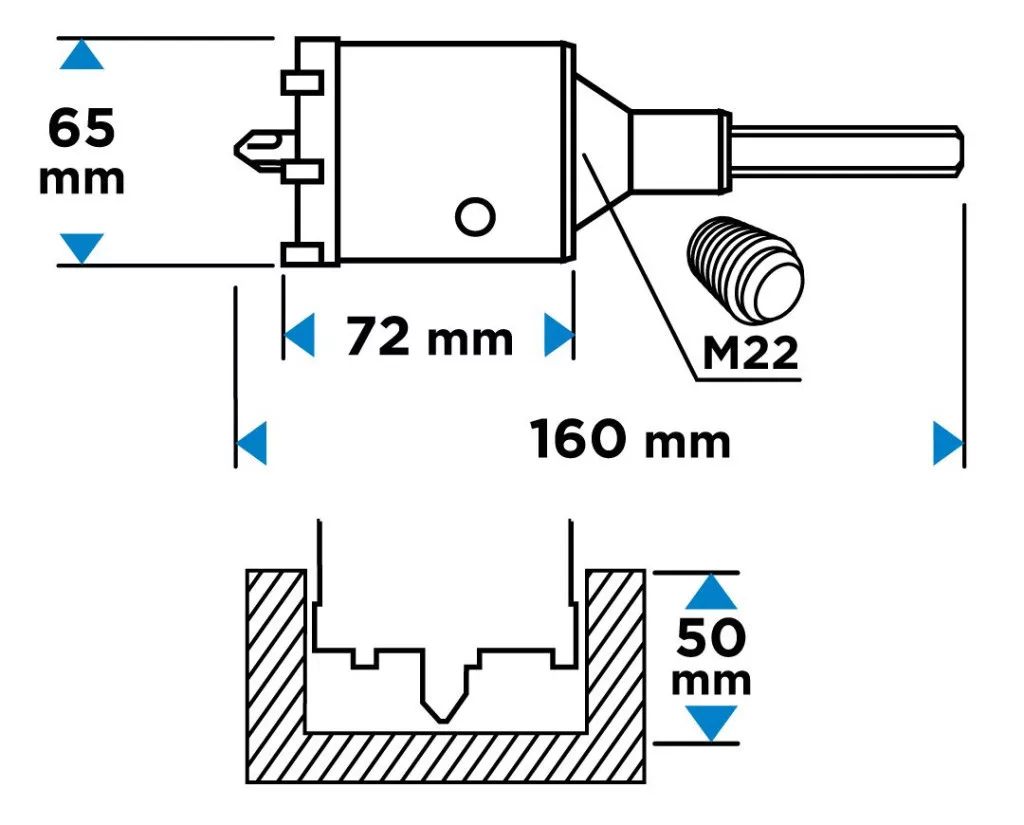 A készlet tartalmaz egy 40 Cr acélból készült hatlapfejű adaptert és egy 8 mm átmérőjű, 110 mm hosszú előfúrót. A 200 mm összhosszúságú adapter és az M22-es menet egyszerű és stabil rögzítést tesz lehetővé, miközben biztosítja a sima és pontos fúrást. A koronafúró magassága 72 mm, ami akár 50 mm-es fúrási mélységet tesz lehetővé – ideális számos építési és felújítási alkalmazáshoz.