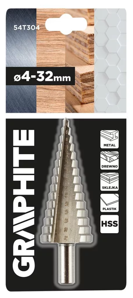 A GRAPHITE 4-32 mm 54T304 lépcsős fúró egy robusztus HSS acélból készült fúrószár, fokozati technikával. Segítségével 4 és 32 mm közötti átmérőjű furatokat készíthet. Tökéletes lesz fémlemez, műanyag és fa megmunkálásához. Otthoni használatra ajánlott.