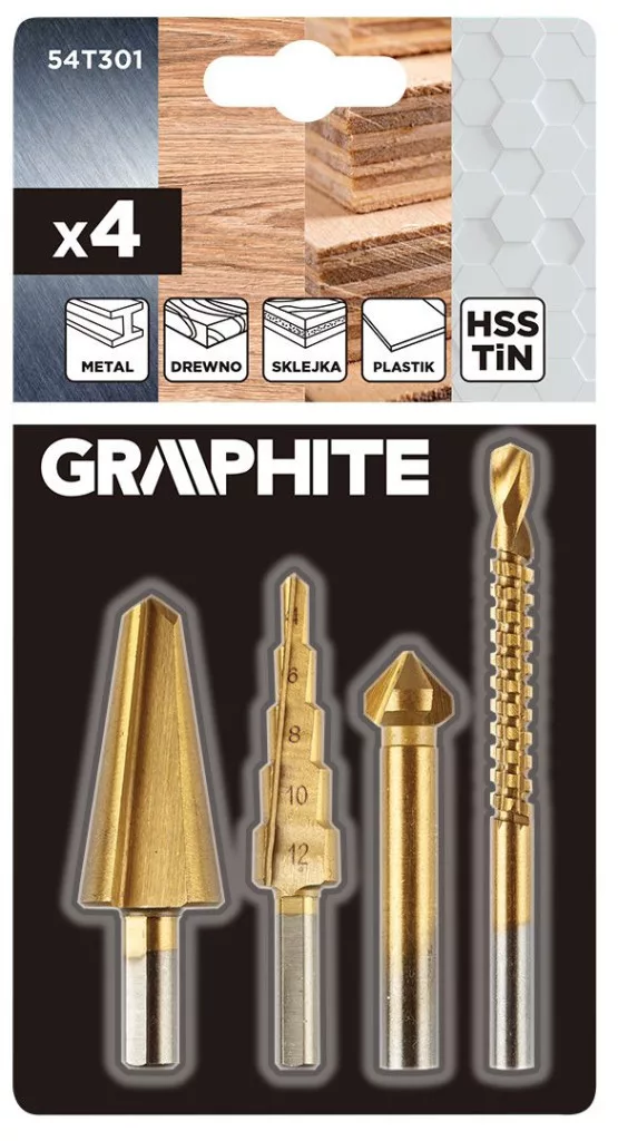 Lépcsősfúró 4-12 mm, fúrómaró 12,4 mm, marófej 6 x 90 mm, kúpsüllyesztő 8-20 mm, TiN, 4 darabos készlet Az 54T301 a GRAPHITE-tól egy 4 darabos készlet (lépcsőfúró, fúrómaró, marófej és kúpsüllyesztő), amely robusztus HSS acélból készült, TIN bevonattal. A szerszámok fémlemez, műanyag és fa megmunkálásához ajánlottak. Barkácsolóknak ajánlott.