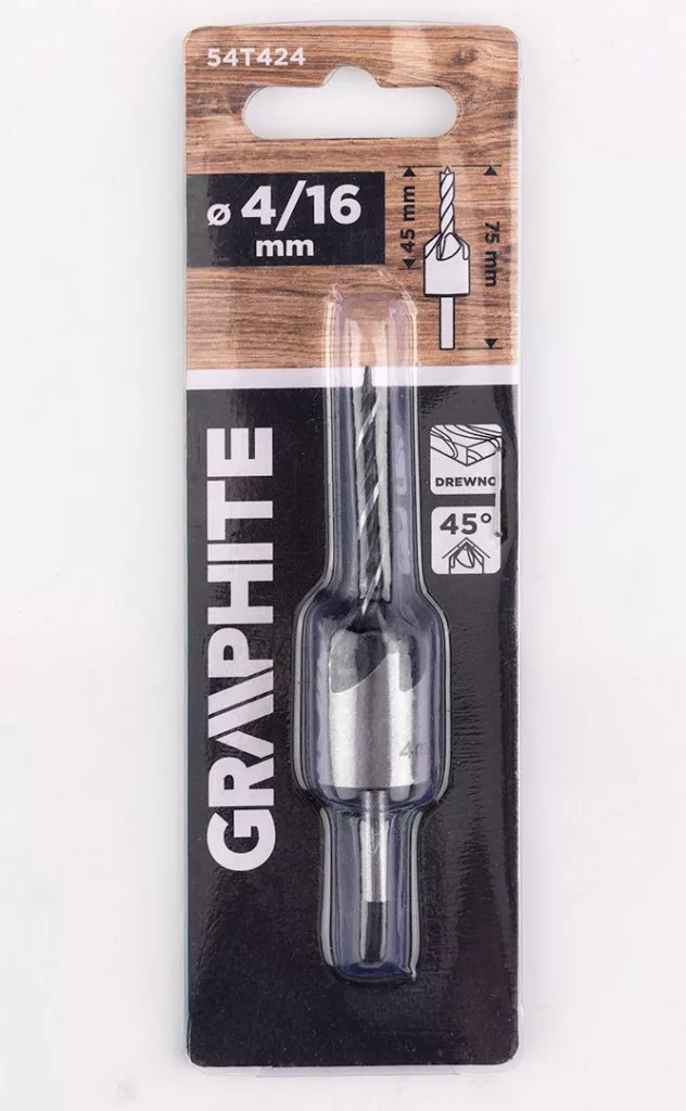 A GRAPHITE 54T424 4 mm/16 mm-es fafúrója 4 mm-es fúróátmérővel, 16 mm-es fazettás átmérővel és 75 mm-es teljes hosszal rendelkezik. Hengeres tokmányal felszerelve, süllyesztett rögzítőcsavarok furatainak fúrásához vagy további furatok süllyesztéséhez ajánlott. A GRAPHITE fa fazettás fúrószár jó kiegészítője lesz minden barkácsoló felszerelésének.