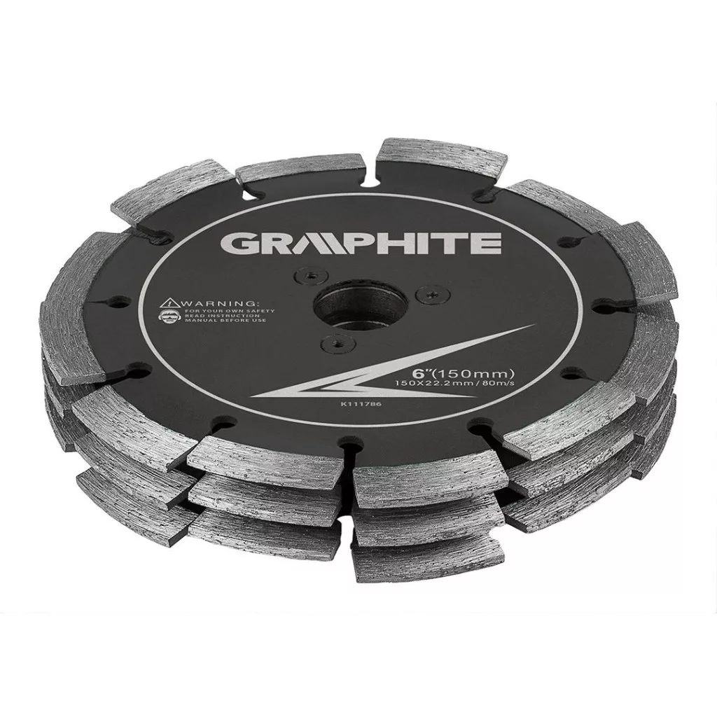A GRAPHITE 59G371, 57H696 kombinált tárcsa az 59G371 cikkszámú burkológéphez tervezett tárcsa. A 150 mm átmérőjű, 22,2 mm-es rögzítőfurattal rendelkező hármas szett betonba történő hornyoláshoz készült - nincs szükség vésésre. A kereszt alakú szegmensek tiszta, 30 mm széles rést hoznak létre, így könnyen egyenletes barázdákat lehet létrehozni. A GRAPHITE fűrészlap 36 szegmenssel rendelkezik, a gyémántszegmensek magassága 9,5 mm, teljes szélessége 27 mm, maximális fordulatszáma pedig 10 200 rpm. A termék megfelel az EN 13236 szabvány követelményeinek, ami megerősíti a beton megmunkálására való alkalmasságát.