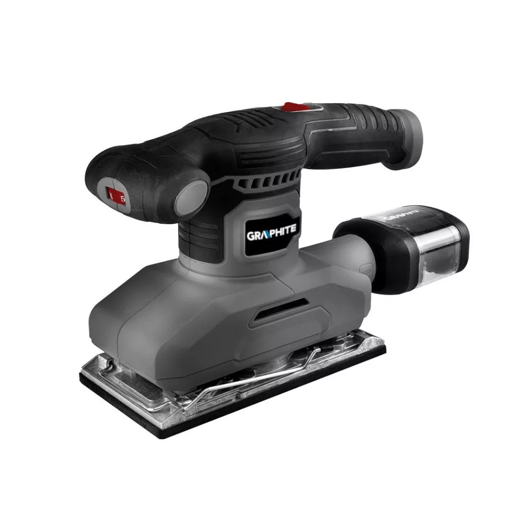 GRAPHITE rezgőcsiszoló, 260W, 90x187mm-es talp. Rendeltetése: kölünféle anyagú felületek végső megmunkálása. A csiszoló talp méretei: 90x187 mm. A berendezés az ergonomikus alakjából és megfelelő kiegyensúlyozottságából fakadóan magas szintű komfortérzetet biztosít a munkavégzéskor. A berendezés háza és kézi fogantyúja csúszásgátló bevonattal van ellátva. A csiszológép kapcsolója folyamatos üzem funkció gombbal rendelkezik. A csiszológép fokozatmentes sebesség szabályozóval rendelkezik. A csiszológép fordulatszáma terhelés nélkül 7000 - 13000 min⁻¹, az oszcilláció maximális mennyisége üresjáratban 14000 - 26000 min⁻¹. Az oszcilláció amplitúdója 2 mm. A csiszoló berendezés a magas hőmérséklettel szemben ellenálló alumínium ötvözetből készült talpal rendelkezik. A gép súlya 1,7 kg, 3m-es gumibevonatú kábellel szerelve.A berendezés integrált por elvezető rendszerrel és gyors csiszolópapír cserélhetőségi rendszerrel rendelkezik. A csiszoló gép készletében tartalék porzsák és csiszoló papír található.