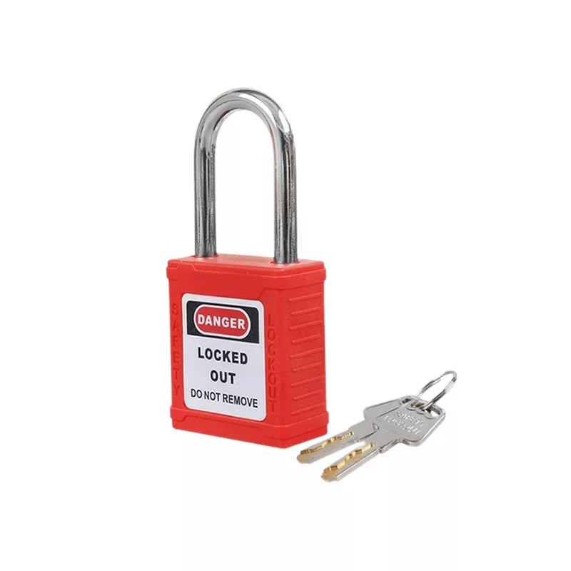 Munkavédelmi LOTO lakat, acél kengyellel, piros színben.