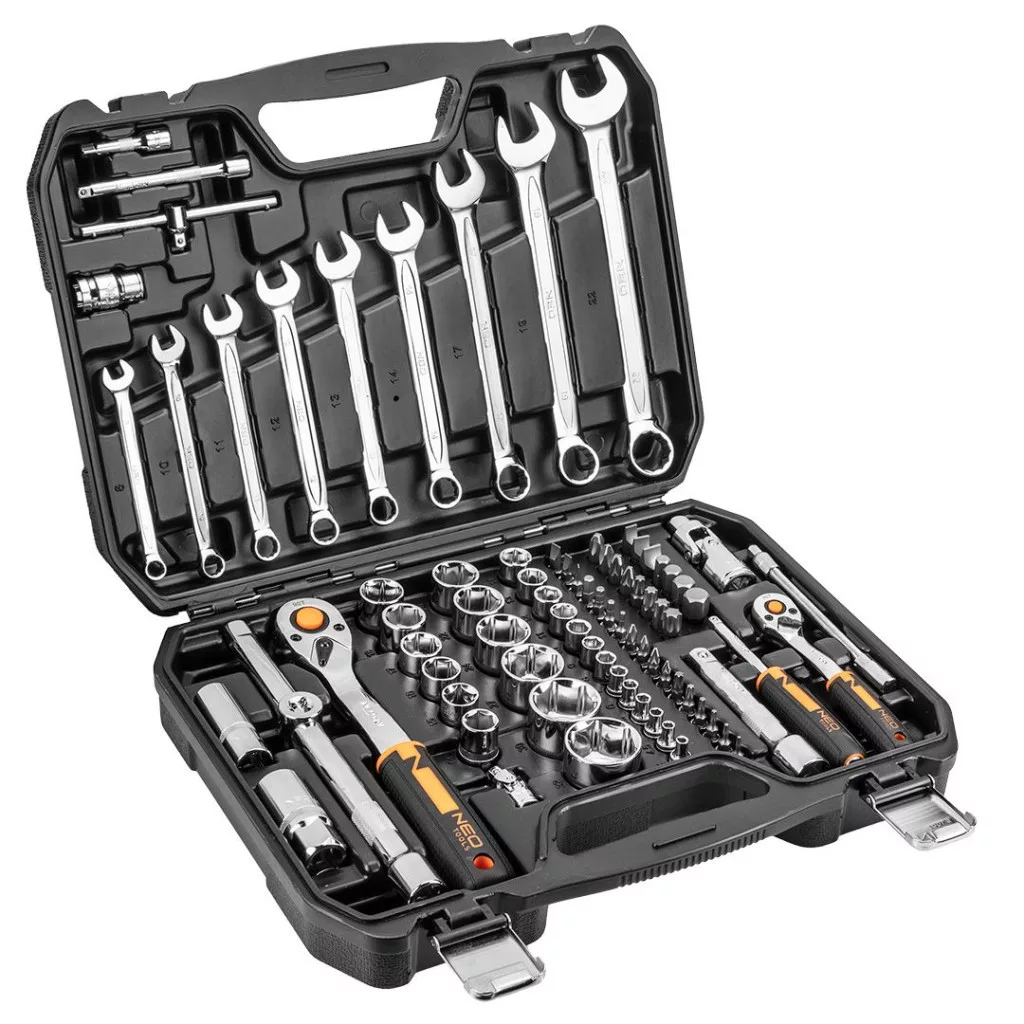 A NEO ¼"-os és ½"-os dugókulcs készlet (kat. sz. 10-058) 82 db kiváló minőségű króm-vanádium acélból készült elemből áll. A készlet részét képezi egy ¼"-os és egy ½"-os racsnis hajtókar is (hosszú élettartamú, 90 fogas kilincsművel), hajlított ergonómikus markolattal. A készlet beütött feliratos, hatlapú dugókulcsok (4-32 mm közötti méretekben) és csavarhúzó bitek (lapos, kereszt, imbusz, Torx) gazdag sorozatait is tartalmazza. A hordtáskában helyet kaptak villáskulcsok is (9 db, 8 mm – 22 mm). Ezt egészíti ki egy gazdag tartozékok csomag. Az egyes elemek függőleges rendű elhelyezése a hordtáskában megkönnyíti a szükséges készlet gyorsabb összeállítását. A kulcsok praktikus, szolid, fém zárakkal és kézreálló hordfogantyúval felszerelt műanyag hordtáskába van csomagolva. A termék megbízhatóságát bizonyítja a 25 éves jótállás. A NEO márka a professzionális igényeket is kielégíti.