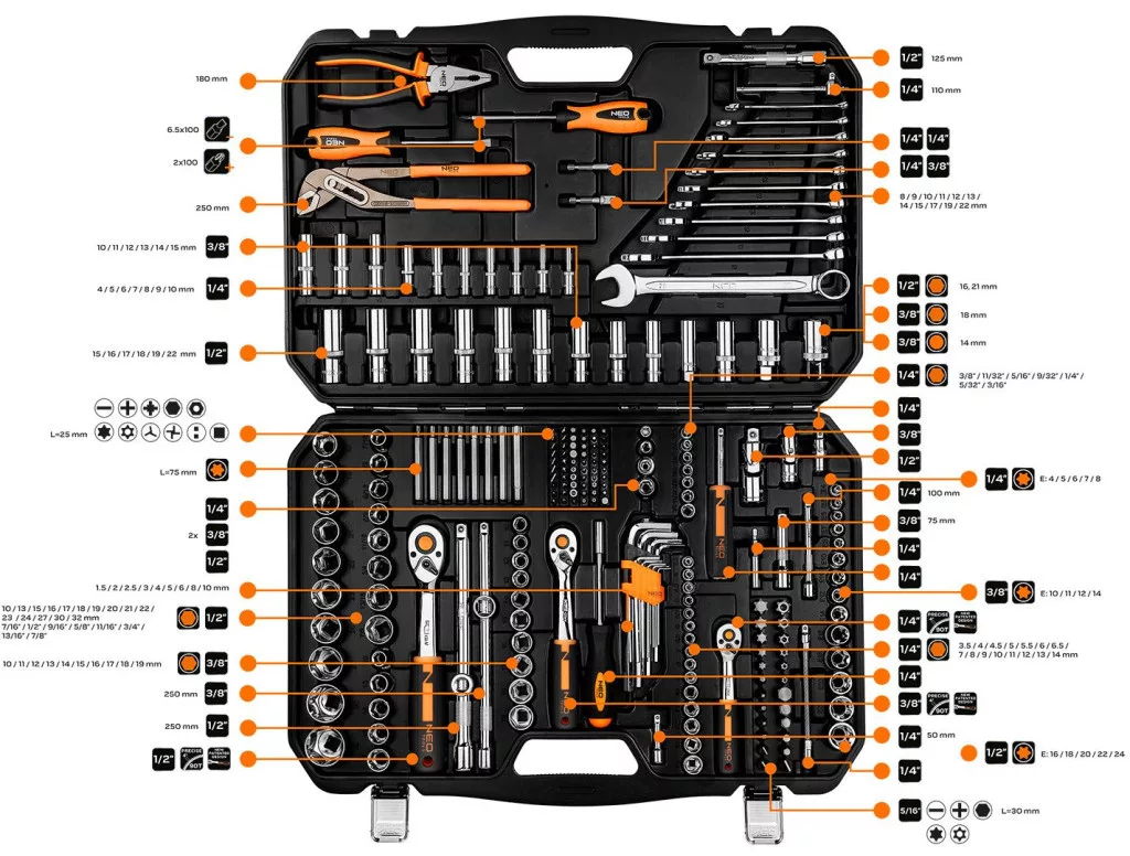 A NEO dugókulcs készlet (kat. sz. 10-078) a legnagyobb készlet az ajánlatunkban. A készletben 233 db kiváló minőségű króm-vanádium acélból készült, ¼", ½", valamint ⅜" méretű elem található. A kulcsok praktikus, szolid, fém zárakkal és kézreálló hordfogantyúval felszerelt műanyag hordtáskába vannak csomagolva. A hordtáskában komplett szerszámcsomagot találunk: hatlapú dugókulcsokat (rövideket és hosszúkat), E típusú dugókulcsokat, csavarozó biteket (különféle konfugurációkban, köztük meghosszabbítottakkal a mély fészekben ülő csavarokhoz), imbuszkulcsokat (kényelmes tartóval együtt), csillag-villáskulcsokat (a leggyakoribb méretekben, 8 mm-től 22 mm-ig), csavarozógép közdarabokat (ennek köszönhetően a szerszámok az adott elektromos szerszámhoz konfigurálhatók), négy gyertyakulcsot (az adott gyertyatípushoz gyorsan lehet tökéletesen illeszkedő T-szárú gyertyakulcsot összeállítani), valamint tartozékokat. A készlet dugókulcsai között megtalálhatók a metrikus és a colos változatok is, ez gyakorlatilag kizárja annak lehetőségét, hogy ne legyen az adott csavarhoz illeszthető szerszámunk. Ezt a gazdag készletet egészítik ki mégtovább csavarhúzók, kombináltfogók és csőfogók, így lehetőség nyílik a munkavégzésre a szokásostól eltérő megoldásokat igénylő helyzetekben is. A hajlított racsnis hajtókarok (3 db) kilincsműve 90-fogas, ennek köszönhetően lehet velük dolgozni korlátozott hozzáférhetőségű helyeken is (a kilincs már 5°-os elfordulásnál új fogárokba húz). A készlet mindazon felhasználóknak szánt, akik szeretnének a lehető leggazdagabb szerszám-összeállítással rendelkezni. A nemzetközi TÜV tanúsítvány és a 25 éves jótállás a szerszám megbízhatóságát és kiváló minőségét bizonyítja. A NEO márka a professzionális igényeket is kielégíti.
