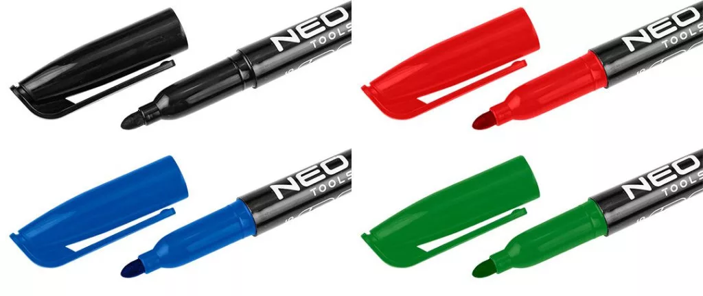 Építőmarker, 4 színű, tartós, vízálló, olajbázisú, 4 darab 13-857 a NEO TOOLS-tól egy 4 darabos készlet, 4 mm átmérőjű kerek hegyű építőmarker. A marker négyféle tinta színű változatban kapható: zöld, kék, fekete és piros. Olajalapú, tartós, gyorsan száradó és vízálló. Kiválóan használható különféle felületeken, többek között fémen, üvegen, kövön, fán és műanyagon. Professzionális és otthoni használatra egyaránt ajánlott.