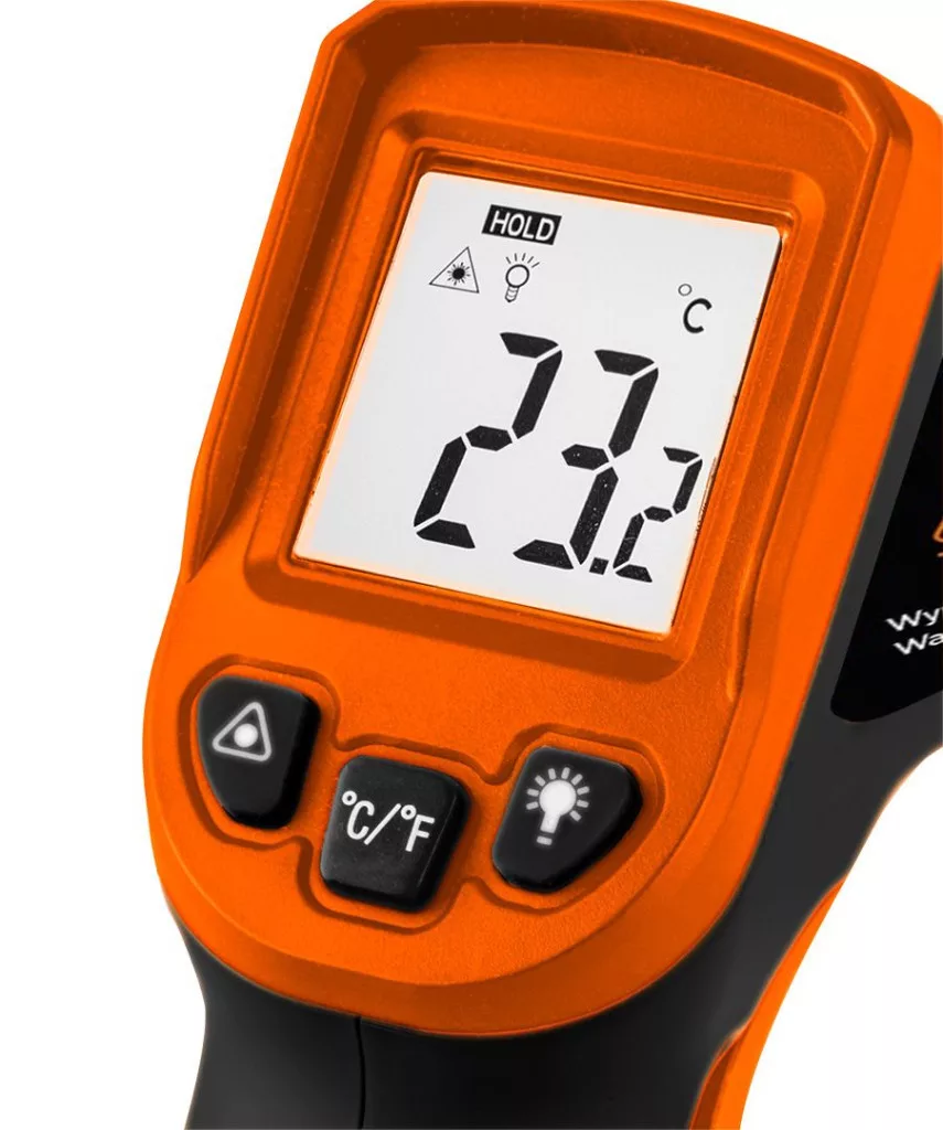 A NEO márkájú pirométer háttérvilágítással ellátott kijelzővel rendelkezik, és lehetővé teszi az érintés nélküli mérést. Celsius és Fahrenheit mértékegységek közül lehet választani. Két 1,5 V-os AA elemmel működik, amelyek a készlet részét képezik. Ez egy professzionális, szakembereknek ajánlott készülék. Nem orvosi eszköz.