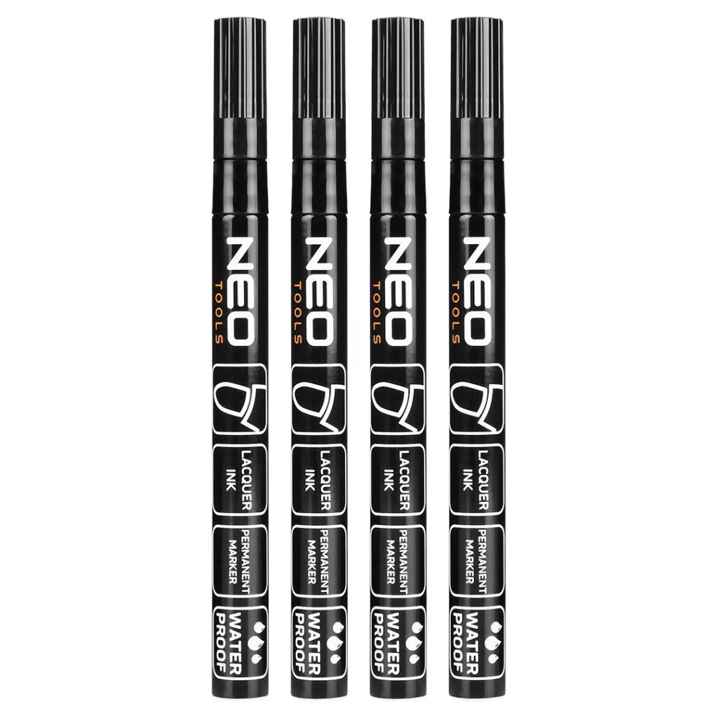 Építőipari marker, fekete, tartós, vízálló, lakk, alumínium, 4 darab 13-852 a NEO TOOLS-tól egy 4 darabos készlet, kerek hegyű, 3 mm átmérőjű építőmarker. Különböző felületeken ajánlott a használatuk, többek között: fém, üveg, kő, fa és műanyag. Fekete tinta, lakk, tartós és gyorsan száradó, valamint vízálló tulajdonságokkal rendelkeznek. Könnyű alumíniumtestük megakadályozza a tinta kiszáradását, így hónapokig használatra készen állnak. A NEO TOOLS márkájú építőipari filctollak számos munkahelyi és otthoni projekthez jól használhatóak.