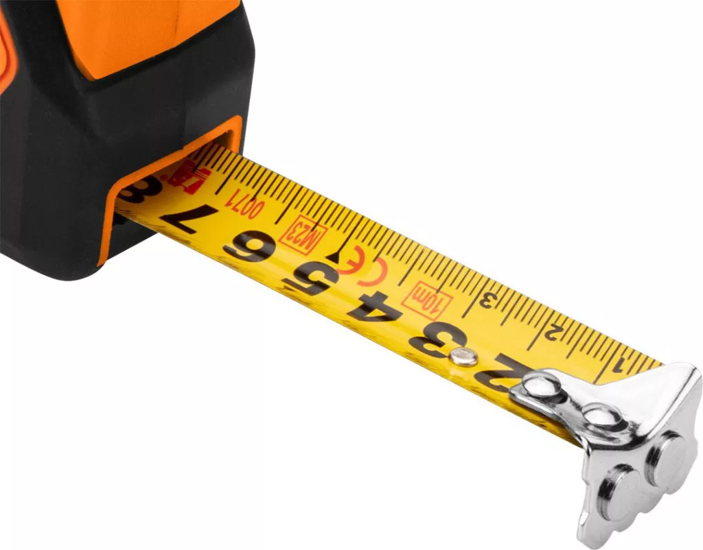A NEO TOOLS 7,5 m x 25 mm-es acél gördülő mérőszalag, automatikus zár, stop gomb, mágnes 67-234 a NEO TOOLS 7,5 m hosszú és 25 mm széles mérőszalaggal rendelkező szerszáma. Praktikus automatikus megállító funkcióval van felszerelve, amely megakadályozza, hogy a mérőszalag kinyújtáskor magától visszahúzódjon, valamint lehetőség van a reteszelés használatára. A mágnes megkönnyíti a mérőszalag jobb stabilizálását, a nagyított nyomtatás pedig befolyásolja a mérések leolvasásának sebességét. A NEO TOOLS mérőszalag két anyagból készült burkolatból készül. Fényes bevonattal rendelkezik, amely védi a beosztást a kopástól. A beépített lengéscsillapító viszont befolyásolja a simább gördülési folyamatot. A szerszám megfelel a MID II. osztályú szabványnak. A nejlon hozzáadása hozzájárul e NEO TOOLS mérőszalag tartósságához és kényelmes használatához.
