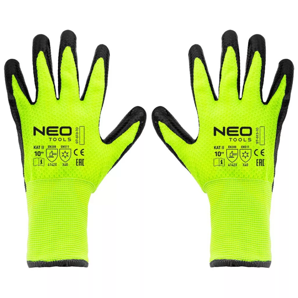 A NEO 10-es méretű szigetelt munkakesztyű, latexbevonatú nejlon, 4142X 97-613-10, latexbevonatú nejlonból készült. Magas kopásállósággal (0-4) 4, éles tárgyakkal való vágásállósággal (0-5) 1, szakadásállósággal (0-4) 4 és szúrásállósággal (0-4) 2. Az EN ISO 13997 X szabvány szerinti vágásállóságuk is megkülönbözteti őket. A kesztyű jól illeszkedik a kézbe. Mindenféle szállításhoz, kezeléshez, tároláshoz, összeszerelési munkákhoz, kis alkatrészek gyártásához, barkácsoláshoz, autóiparhoz és kertészkedéshez használhatóak. Védik a kezet a hidegtől, a szennyeződésektől, a karcolásoktól, a lenyomatoktól és a káros munkakörülményektől. Megfelelő kialakítással - megakadályozza, hogy a szerszámok kicsússzanak a kézből. A hideg elleni védelmet nyújtó EN 388, 22242X és EN511 szabványoknak való megfelelést tanúsító CE-jelölés a biztonság garanciája, amely bizonyítja, hogy a NEO márkájú termék megfelel az összes uniós követelménynek.