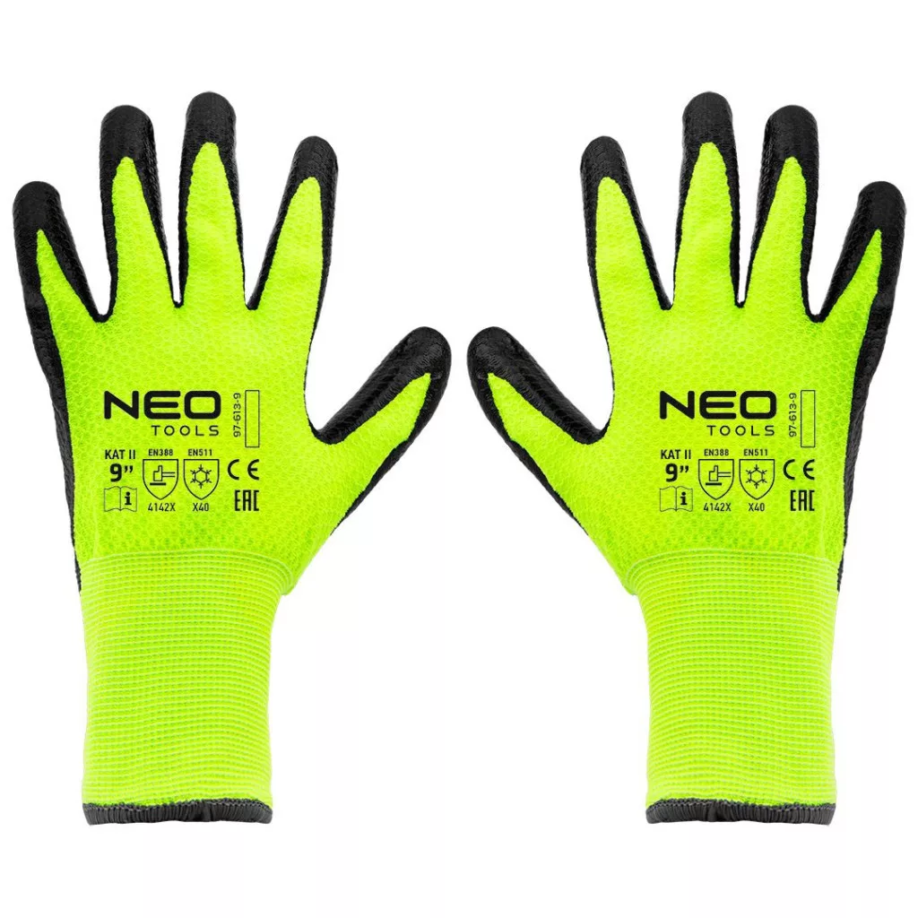 A NEO 9-es méretű, latexbevonatú nejlon szigetelt munkakesztyű, 4142X 97-613-9, latexbevonatú nejlonból készült. Magas kopásállósággal (0-4) 4, éles tárgyakkal való vágásállósággal (0-5) 1, szakadásállósággal (0-4) 4 és szúrásállósággal (0-4) 2. Az EN ISO 13997 X szabvány szerinti vágásállóságuk is megkülönbözteti őket. A kesztyű jól illeszkedik a kézbe. Mindenféle szállításhoz, kezeléshez, tároláshoz, összeszerelési munkákhoz, kis alkatrészek gyártásához, barkácsoláshoz, autóiparhoz és kertészkedéshez használhatóak. Védik a kezet a hidegtől, a szennyeződésektől, a karcolásoktól, a lenyomatoktól és a káros munkakörülményektől. Megfelelő kialakítással - megakadályozza, hogy a szerszámok kicsússzanak a kézből. A hideg elleni védelmet nyújtó EN 388, 22242X és EN511 szabványoknak való megfelelést tanúsító CE-jelölés a biztonság garanciája, amely bizonyítja, hogy a NEO márkájú termék megfelel az összes uniós követelménynek.