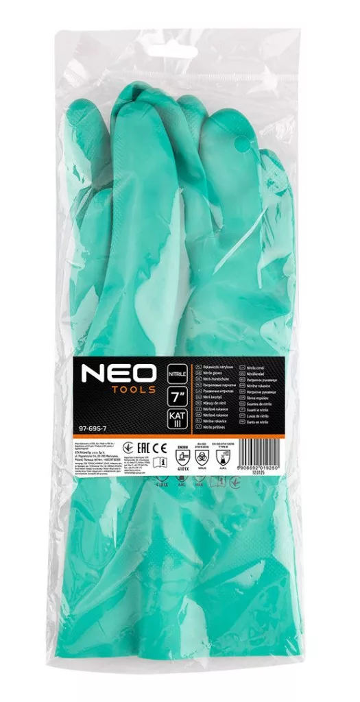 A NEO TOOLS 7-es méretű, 97-695-7-es, vegyszerálló nitril kesztyű kemény nitrilből készült, III-as védőkategóriájú kesztyű. Megfelelnek az EN 388 szabványnak, és kopás (4), vágás (1), szakadás (0) és szúrás (1) ellenállást biztosítanak, valamint az EN ISO 13997 (X) szabványnak. A NEO TOOLS kesztyűk az EN 374-1 szabvány szerint védelmet nyújtanak a vegyi anyagokkal szemben: metanol (A), n-heptán (J), 40%-os nátrium-hidroxid (K) és 96%-os kénsav (L), és megfelelnek az EN 374-5 szabványnak, garantálva a vírusok, gombák és baktériumok elleni védelmet. A puha és rugalmas szerkezet jó illeszkedést biztosít a kézhez, a hosszú mandzsetta pedig védi a csuklót és az alkart. Ellenállnak a víznek, zsíroknak, zsíroknak, olajoknak, mosószereknek és vegyi anyagoknak. Alkalmas a vegyiparban, a kohászatban, az autóiparban, a tisztítóiparban, a mezőgazdaságban, a halászatban és a gépiparban való használatra. Ezek a NEO TOOLS márka bevált vegyszerálló kesztyűi, amelyek garantálják a biztonságot a munkakörnyezetben.