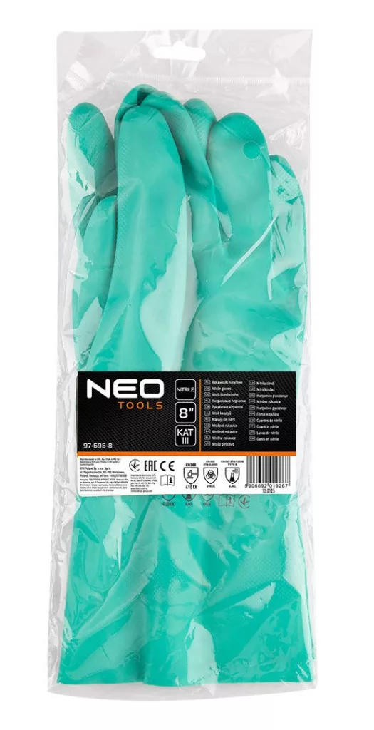 A NEO TOOLS 8-as méretű, 97-695-8-as, vegyszerálló nitril kesztyű kemény nitrilből készült, III-as védőkategóriájú kesztyű. Megfelelnek az EN 388 szabványnak, és kopás (4), vágás (1), szakadás (0) és szúrás (1) ellenállást biztosítanak, valamint az EN ISO 13997 (X) szabványnak. A NEO TOOLS kesztyűk az EN 374-1 szabvány szerint védelmet nyújtanak a vegyi anyagokkal szemben: metanol (A), n-heptán (J), 40%-os nátrium-hidroxid (K) és 96%-os kénsav (L), és megfelelnek az EN 374-5 szabványnak, garantálva a vírusok, gombák és baktériumok elleni védelmet. A puha és rugalmas szerkezet jó illeszkedést biztosít a kézhez, a hosszú mandzsetta pedig védi a csuklót és az alkart. Ellenállnak a víznek, zsíroknak, zsíroknak, olajoknak, mosószereknek és vegyi anyagoknak. Alkalmas a vegyiparban, a kohászatban, az autóiparban, a tisztítóiparban, a mezőgazdaságban, a halászatban és a gépiparban való használatra. Ezek a NEO TOOLS márka bevált vegyszerálló kesztyűi, amelyek garantálják a biztonságot a munkakörnyezetben.