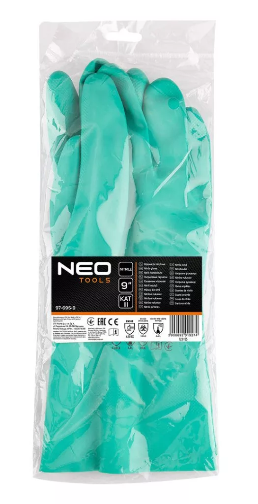 A 9-es méretű, 97-695-9-es NEO TOOLS vegyszerálló nitril kesztyű tartós nitrilből készült, III-as védőkategóriájú kesztyű. Megfelelnek az EN 388 szabványnak, és kopás (4), vágás (1), szakadás (0) és szúrás (1) ellenállást biztosítanak, valamint az EN ISO 13997 (X) szabványnak. A NEO TOOLS kesztyűk az EN 374-1 szabvány szerint védelmet nyújtanak a vegyi anyagokkal szemben: metanol (A), n-heptán (J), 40%-os nátrium-hidroxid (K) és 96%-os kénsav (L), és megfelelnek az EN 374-5 szabványnak, garantálva a vírusok, gombák és baktériumok elleni védelmet. A puha és rugalmas szerkezet jó illeszkedést biztosít a kézhez, a hosszú mandzsetta pedig védi a csuklót és az alkart. Ellenállnak a víznek, zsíroknak, zsíroknak, olajoknak, mosószereknek és vegyi anyagoknak. Alkalmas a vegyiparban, a kohászatban, az autóiparban, a tisztítóiparban, a mezőgazdaságban, a halászatban és a gépiparban való használatra. Ezek a NEO TOOLS márka bevált vegyszerálló kesztyűi, amelyek garantálják a biztonságot a munkakörnyezetben.