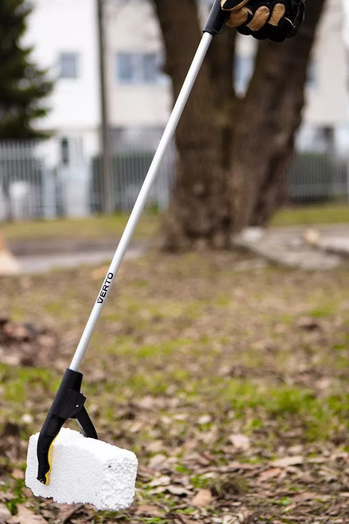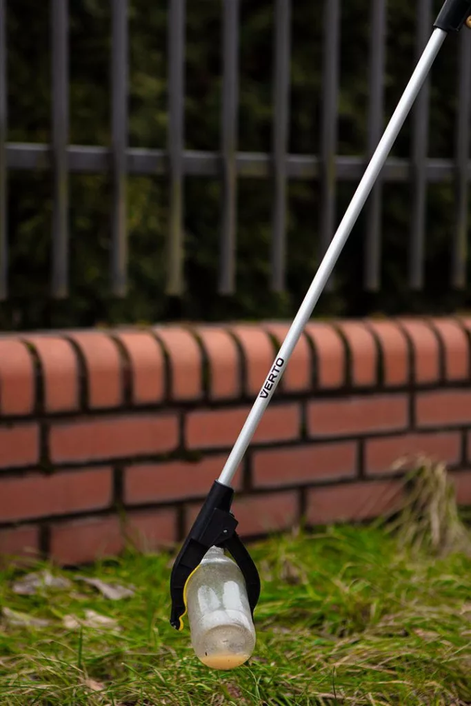 VERTO 15G459 szemétfelszedő. 760 mm hosszú, alumínium szemétfogója legfeljebb 1 kg súlyú tárgyak megfogására és felemelésére szolgál. Alumíniumból készült szerkezet, műanyag (PP) fogantyú, amely a munkarészben TPR gumival van bevonva. Teljes súlya mindössze 150 g. A megfogó rész mágnessel van ellátva fémtárgyak emeléséhez. A csipesz univerzálisan alkalmazható.